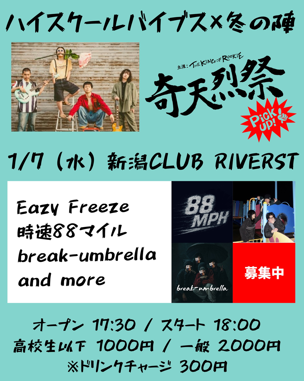 | CAST | EazyFreeze / break-unbrella / 時速88マイル / ※ギリギリまで募集中 / ゲスト:THE KING OF ROOKIE |