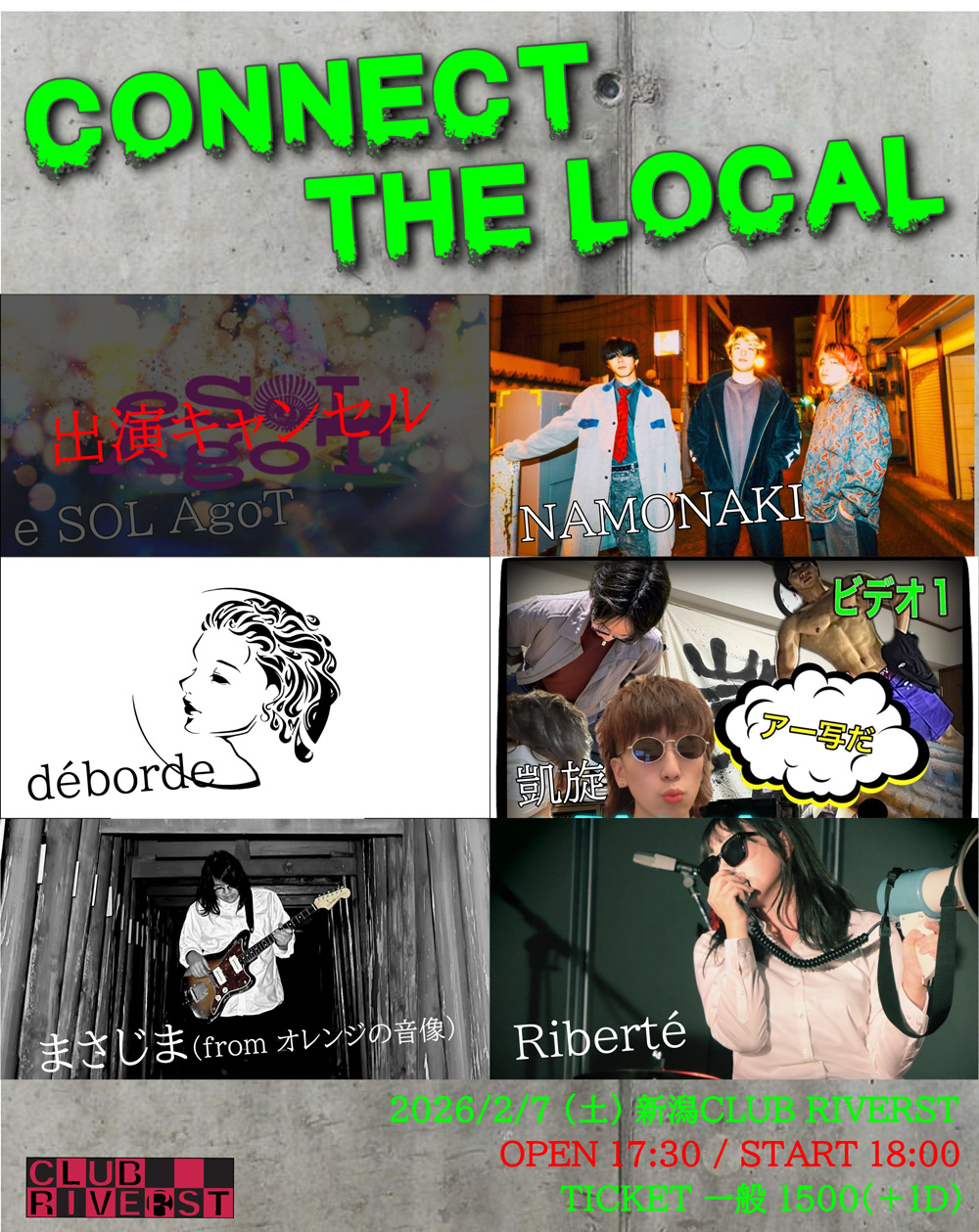 | CAST | 凱旋 / déborde / NAMONAKI / Riverté / まさじま(from オレンジの音像) / ※e SOL AgoTの出演がキャンセルになりました |